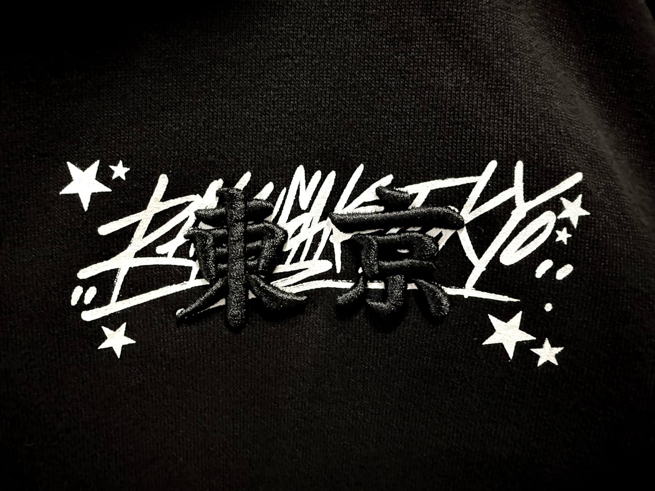 ・楽描東京のロゴはタギングのプリントの上にボディ同色の糸で立体刺繍で入ります。