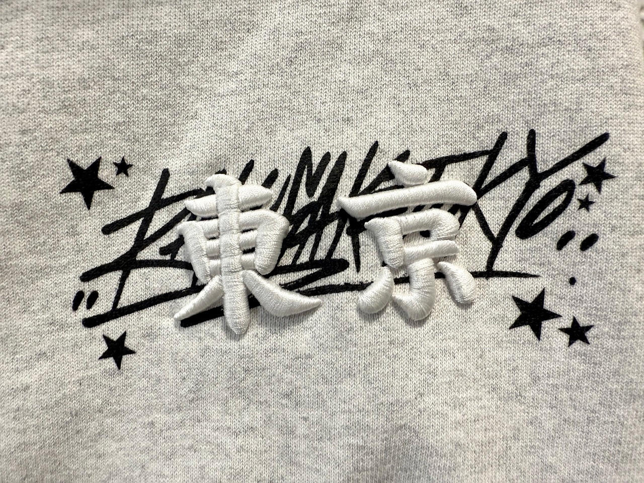 ・楽描東京のロゴはタギングのプリントの上にボディ同色の糸で立体刺繍で入ります。