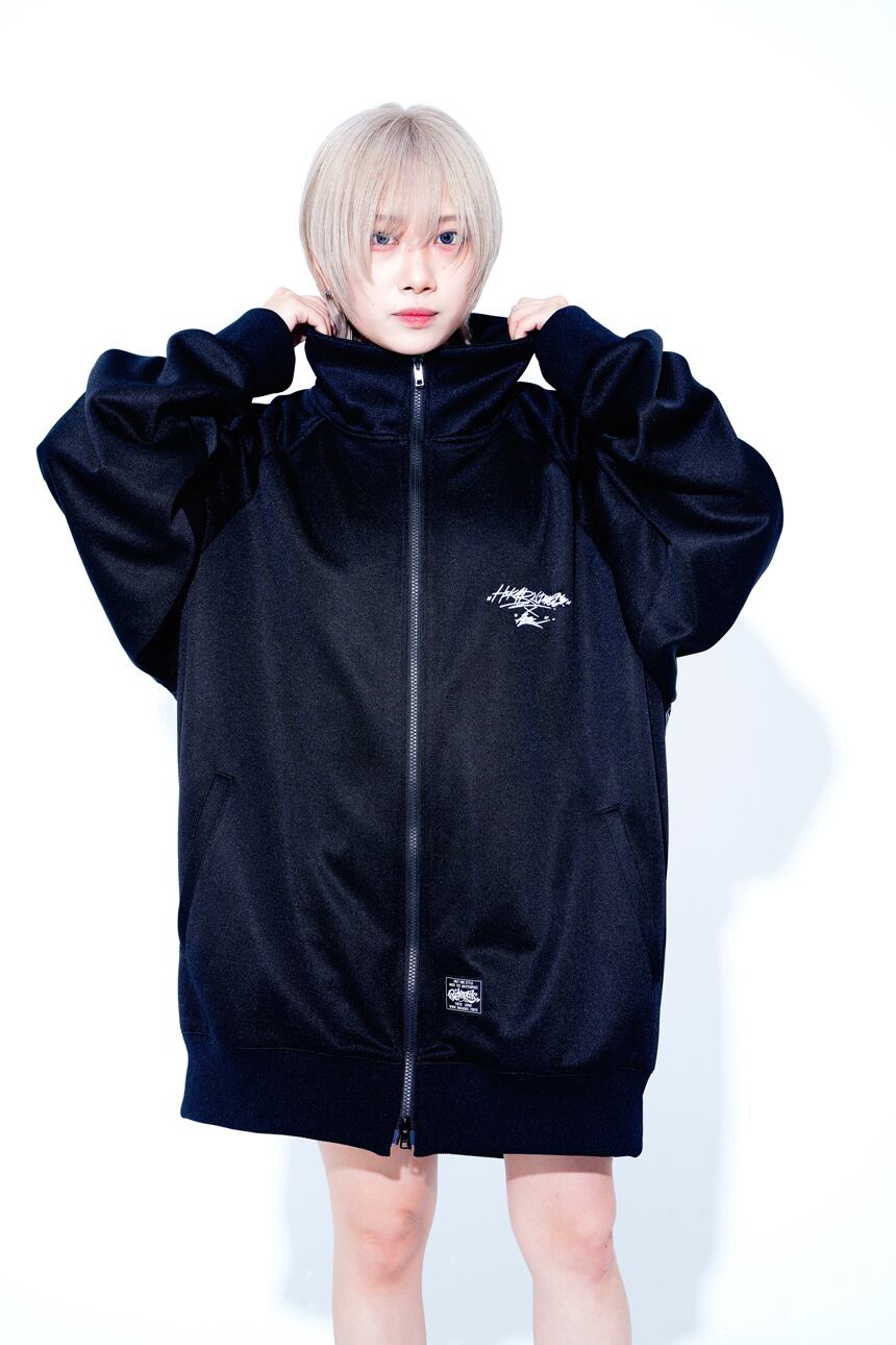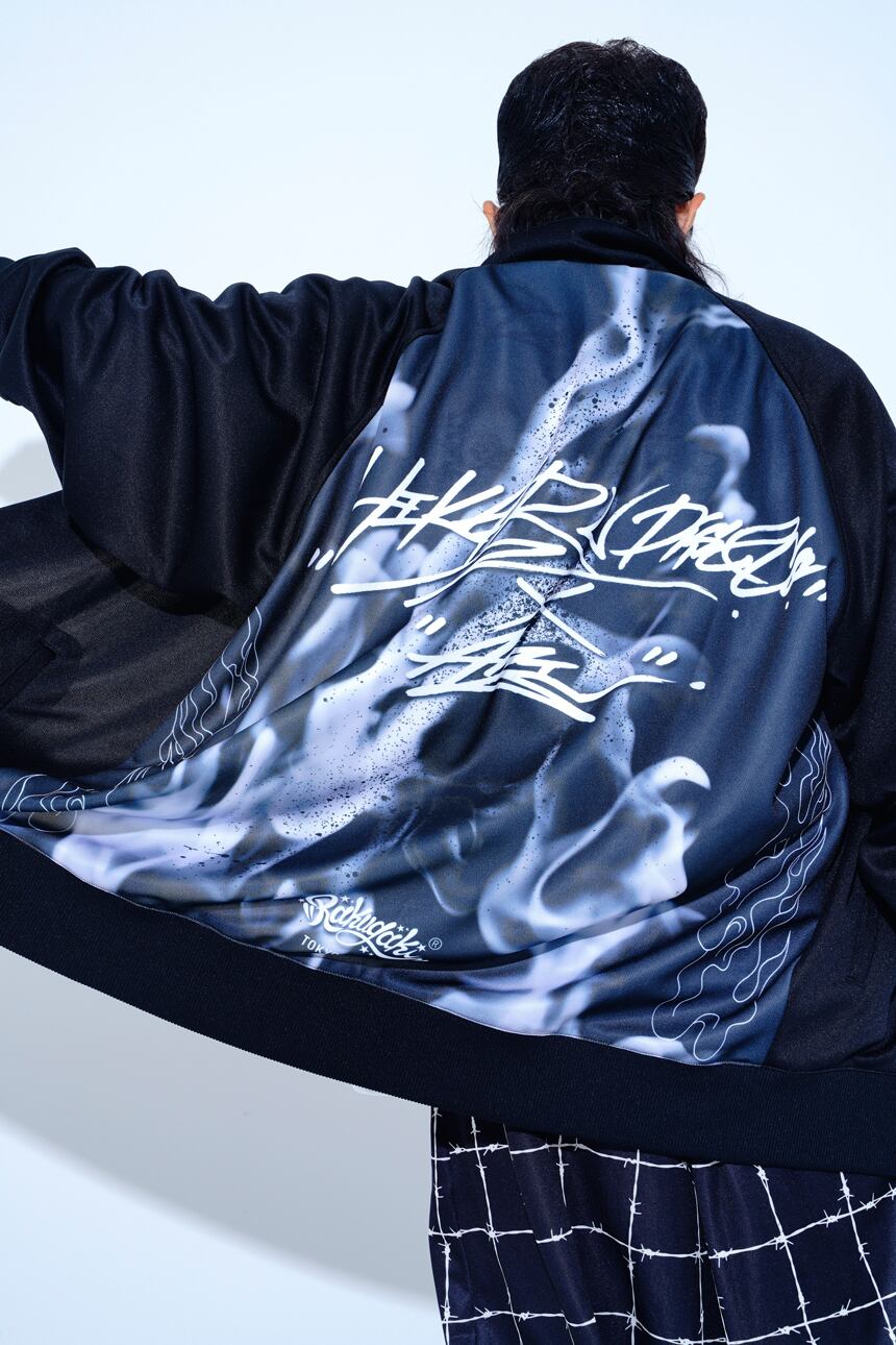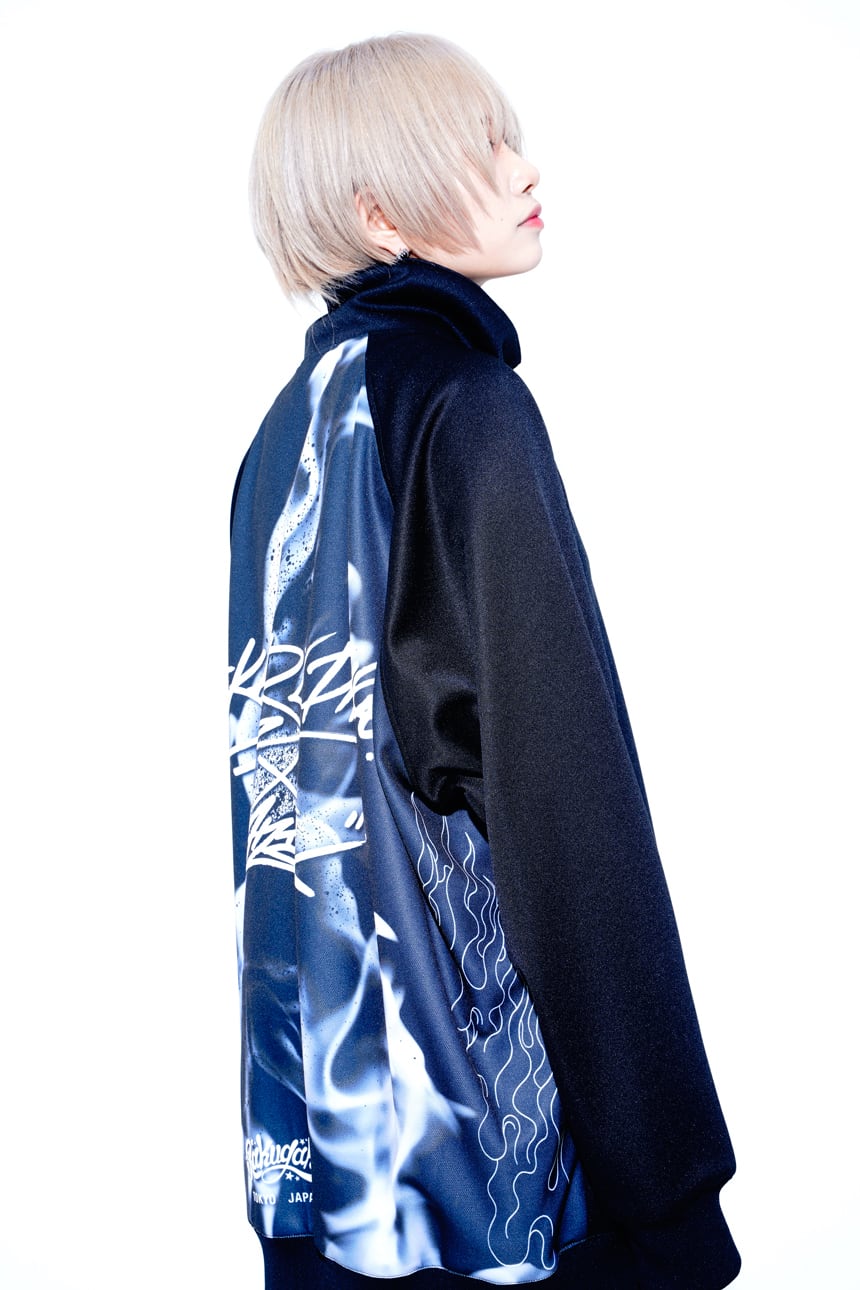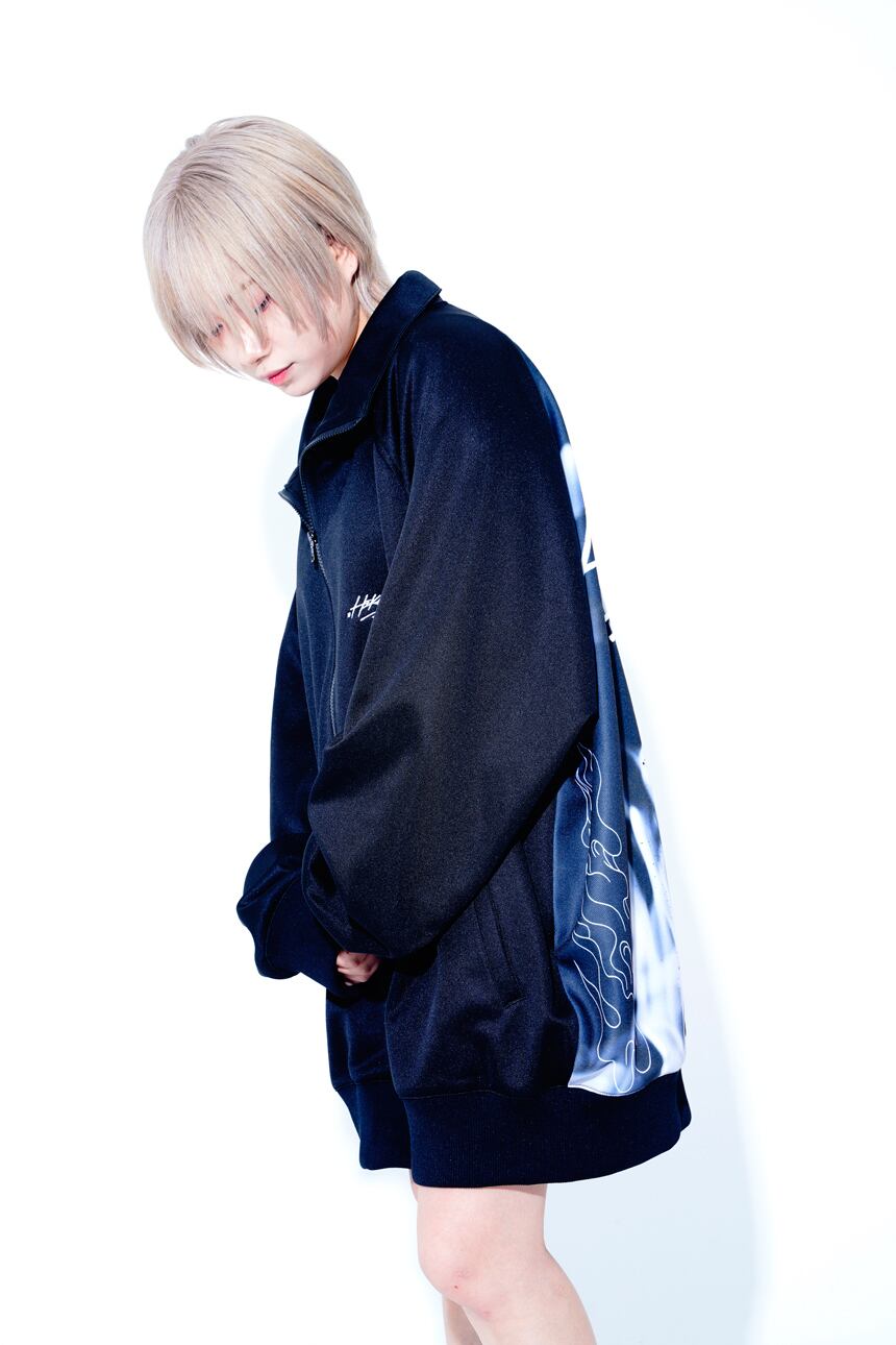 ・今回のデザインテーマは「女子が着たらワンピース」「男子が着たらビッグシルエット」です。 ・フロントにはシンプルなコラボロゴ刺繍。バックには、白い炎のグラッフィックが入った二面性仕様なトラックジャケットです。