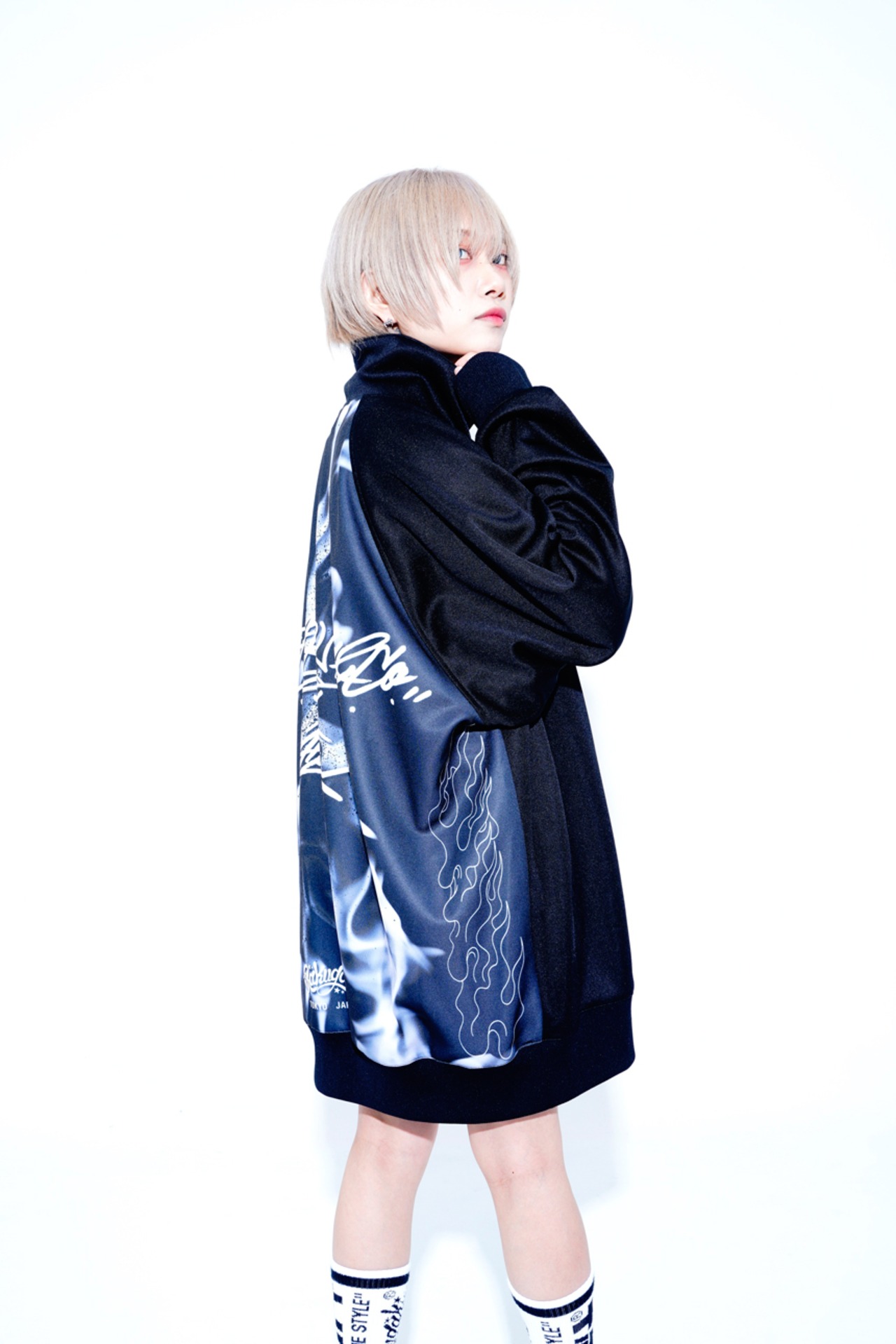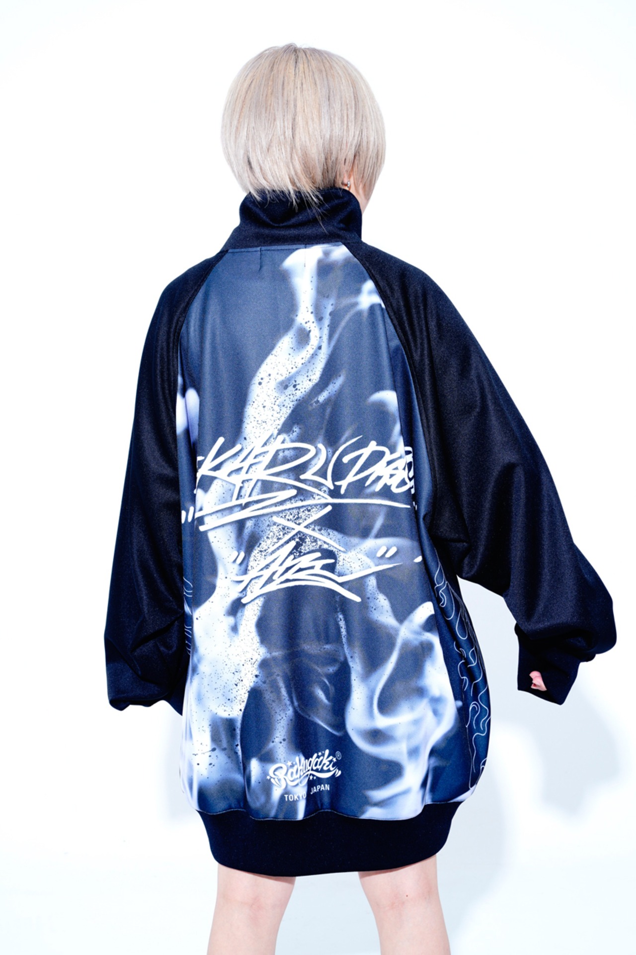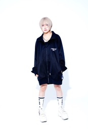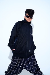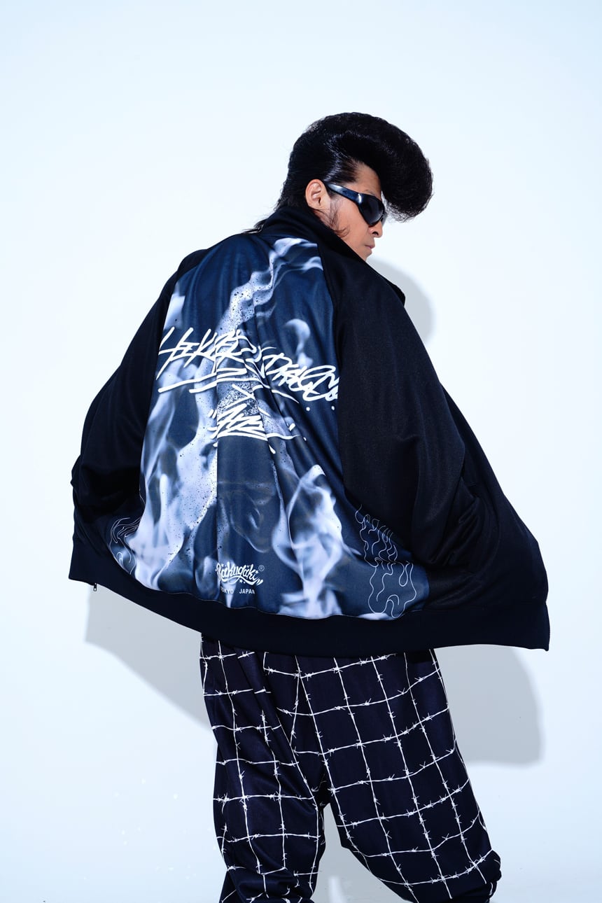 ・今回のデザインテーマは「女子が着たらワンピース」「男子が着たらビッグシルエット」です。 ・フロントにはシンプルなコラボロゴ刺繍。バックには、白い炎のグラッフィックが入った二面性仕様なトラックジャケットです。