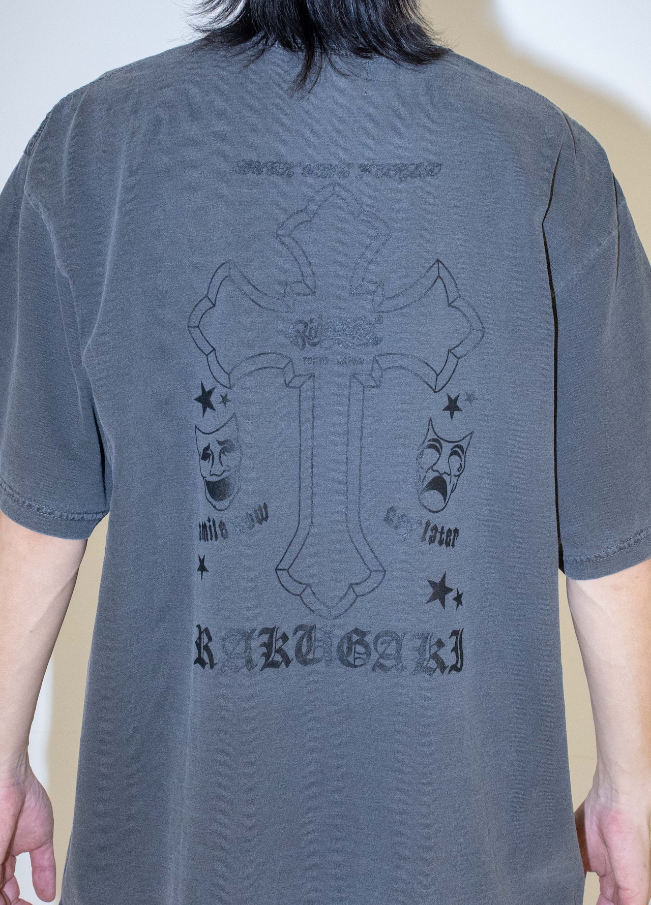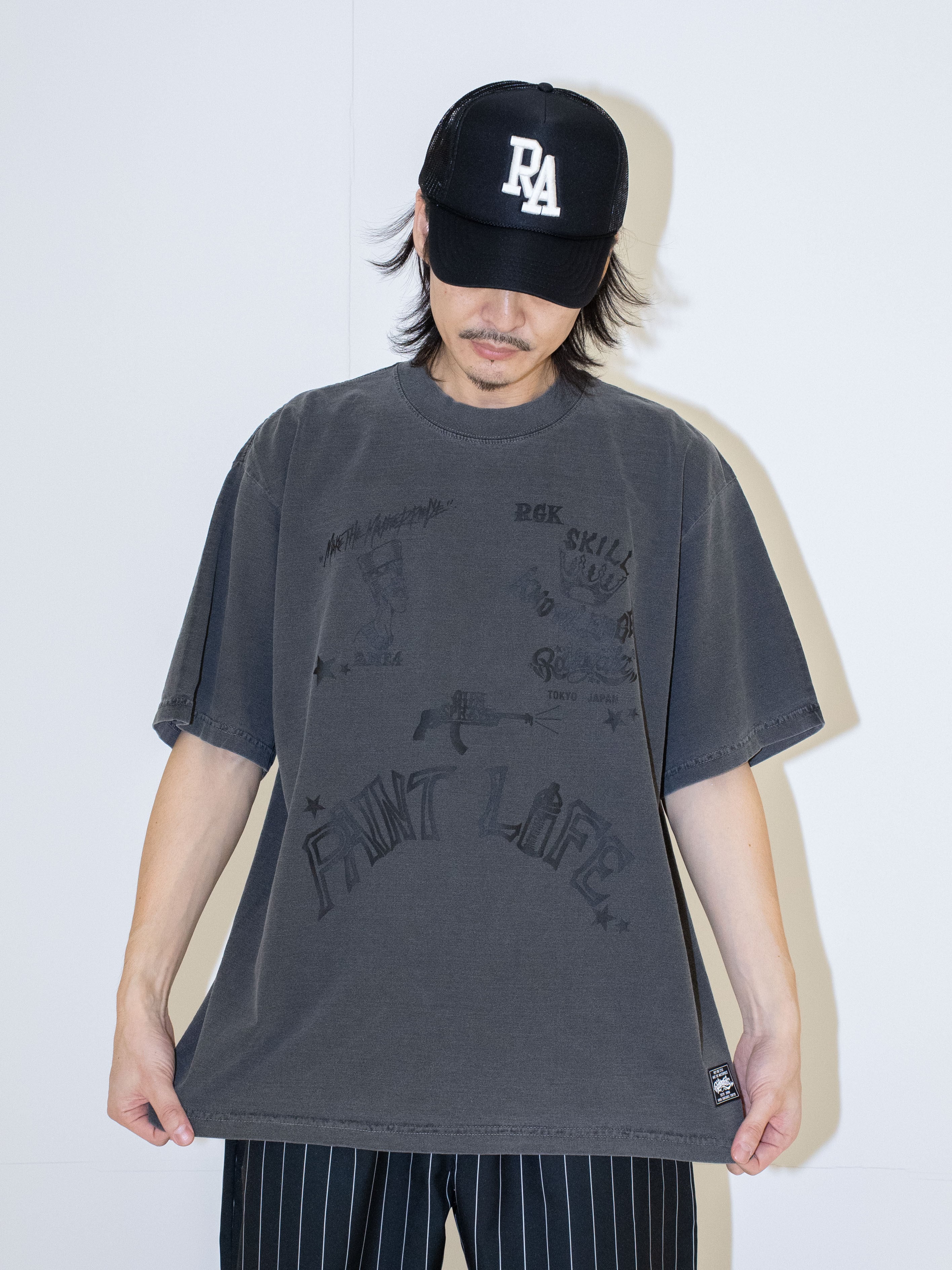 ・長く着ていただけるようにTシャツの生地にもこだわり、7.5ozの厚手の生地を選びました。新品なのに古着のように見えるガーメントダイ加工を施して味わいのある雰囲気に仕上がっています。